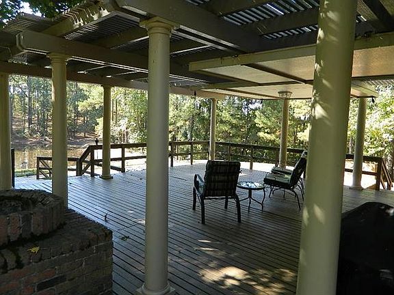 Custom built home nestled among 100 year old oaks and towering pines overlooking a gorgeous lake in total privacy at the end of the road where its always peaceful and quiet. When you drive through the beautiful gated entry of this property it has a park like feel with towering oaks and pines in a serene setting. Property is 99% wooded.