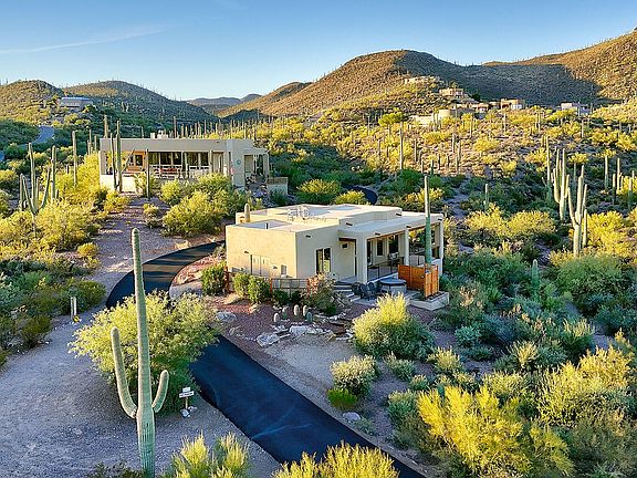 Stunning 2020 Southwestern contemporary on a glorious, saguaro-studded, 3.31-acre lot in the Tucson Mountains near Sweetwater Dr. and Camino De Oeste with sweeping Tucson city, mountain and desert views. Featured are a separate guest home (1,109 square feet) and the main house with 3,028 sq. ft., 3 bedrooms, 2 1/2 baths, no interior steps, great room/dining area with unobstructed city views, remote control gas fireplace with hand carved oak mantel and built-in sound system in great room, patio and garage. Chef's kitchen has oversized center island with prep sink, granite counters, designer stainless steel appliances, counter level wine/beverage fridge, breakfast area and generous pantry. Gracious 14' X 15' primary suite has over-sized walk-in closet, dual vanities, soaking tub and access to the covered patio. 1,859 sq. ft., 52' X 35 fully insulated 5-car garage has work space, storage areas, two mini-split HVAC units, 220V/50A garage wall outlet for welding or EV station. Wonderful expansive covered patio has pool including solar roof heating panels on Pentair phone app and fire pit. Completely furnished turn-key Casita Airbnb/guest house with parking, rents for $210/night, has great room, fully functional kitchen with center island, primary bedroom with washer/dryer, den (could be 2nd bedroom) and hot tub on lower level patio. 80 yard archery range, property zoned for horses and horse facilities and so much more. See to appreciate.