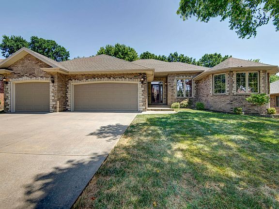Prepare to be impressed with this pristine all brick & stone, walk-out basement home in Southwest Springfield, with a new roof coming soon. This lovely home features approximately 3,668 finished square feet of living space with 5 bedrooms, 3 1/2 baths, and a 3-car garage. Quality built by Mike Robbins the amenities include hardwood floors, raised coffered ceilings, crown molding, custom cabinetry, two, gas-log fireplaces, iron railings and more. Wonderful layout featuring a main floor master suite and office/bedroom, an elegant living room, and spectacular kitchen with granite counters, recently updated Frigidaire Pro Series stainless steel appliances, new hardware, and a spacious walk-in pantry. The lower level features a large family room with lots of windows flooding the home with natural light, a wetbar, three additional bedrooms, a full bath and a storm shelter. The exterior offers a screened-in covered deck, patio and a nice back yard for outdoor enjoyment and entertaining. Call today for your private showing!