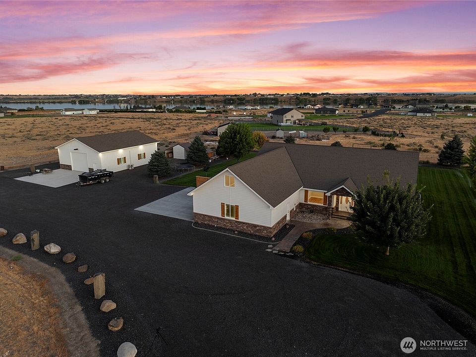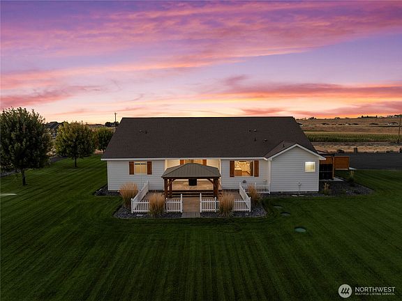 Custom 3151sq/ft 4-bedroom 2.5-bathroom with bonus above garage and 48x50 fully finished shop on 2.93 acres in Moses Lake. Exterior amenities include: 48x50 shop with speakers/1/2 bath/bar/heating/cooling. Landscaped with column rock and mature trees, individual well and septic, gazebo/hot tub included, 3 car garage for extended vehicles, new exterior paint and shutters with stone veneer, swing set, matching storage outbuilding behind shop. Interior features include matte black plumbing and electrical fixtures throughout, new flooring throughout. Updated cabinets/countertops with stainless steel appliances included, office, bonus above garage with mini-split, en-suite primary bedroom with soaking tub and tile shower with jets, and more.