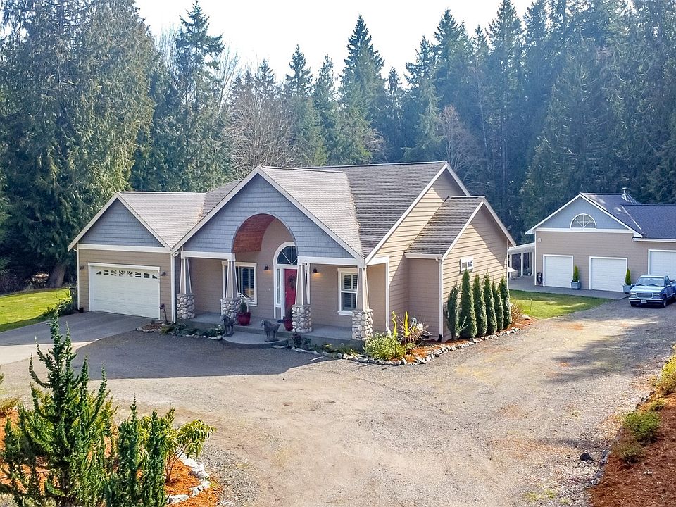 Welcome to your own private oasis on over an acre in Poulsbo, Washington. This craftsman style 3 bedroom, 2.5 bathroom home is a rare find. Enjoy vaulted ceilings and hardwood floors throughout the home, as well as a cozy river rock fireplace in the living room. French doors open up to a beautiful garden oasis complete with new garden shed. Brand new spacious 2 level shop with potential living space above offers endless possibilities, while the backyard features a beautiful garden, fire pit, and covered deck perfect for entertaining. Just 18 minutes from the Bainbridge ferry, this home offers easy access to Seattle while still maintaining a peaceful retreat feel. Don't miss out on the chance to make this your dream home!