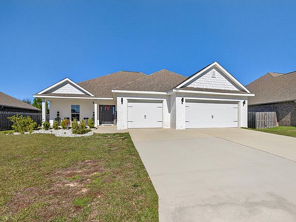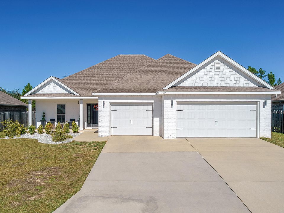 Assumable 5.375% Conventional ARM Loan. This Craftsman-style, all-brick home in the gated community of Woodlyn Meadows. This split-bedroom floor plan offers 9' ceilings, tray ceilings, crown molding, and spacious open living areas. The kitchen features granite counters, upgraded cabinetry, Samsung stainless steel appliances, a walk-in pantry, and a large island with a counter-height breakfast bar. The private primary suite includes a garden tub, tiled shower, double vanity, and oversized walk-in closet. Bedrooms 2 and 3 each have walk-in closets and share a full bath. Enjoy a covered back porch, luxury vinyl plank flooring in main areas, hurricane fabric shields, and a 3-car garage. Convenient to Navy Federal, military bases, shopping, and I-10. Transferable pest control included