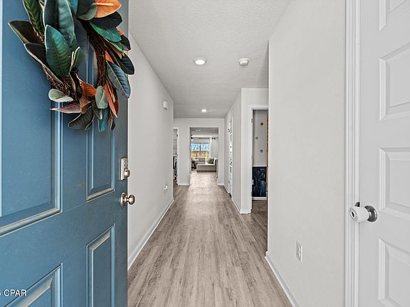 Step inside to an inviting open-concept layout, highlighted by Luxury Vinyl Plank flooring throughout the main areas, plush carpet in the bedrooms, and 8' ceilings that add to the home's spacious feel. The kitchen is both functional and stylish, featuring white cabinetry, a center island, walk-in pantry, durable laminate countertops, and a full suite of stainless steel appliances—including the refrigerator. Blinds are installed throughout for added comfort and convenience.