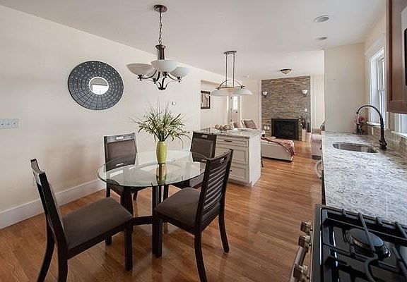 First showing at Open House on Sat 7/21 11-1 PM. Be the second person to live in this great 3 bedroom 2 bath condo. Walk to the beach, close to Vinnin Square and all the shops, Whole Foods, Marshalls, Starbucks, etc., walk to commuter rail and mbta buses. Open concept with stone surrounded gas fireplace, hardwood floors throughout. Kitchen is a chefs delight with stainless steel Samsung appliances, custom Wolf cabinets, there's an island with a wine refrigerator, beautiful granite throughout, recessed lighting. Master bedroom has en-suite bath with designer tile, custom glass door shower with a rain shower head and handheld wand, 2 closets for his and her. 2nd full bathroom with full size front loading washer and dryer. High efficient gas heating and central a/c. Lockable storage in basement. Exclusive use front porch for unit 1. Comes with 2 deeded parking spots. Pets allowed with restrictions.