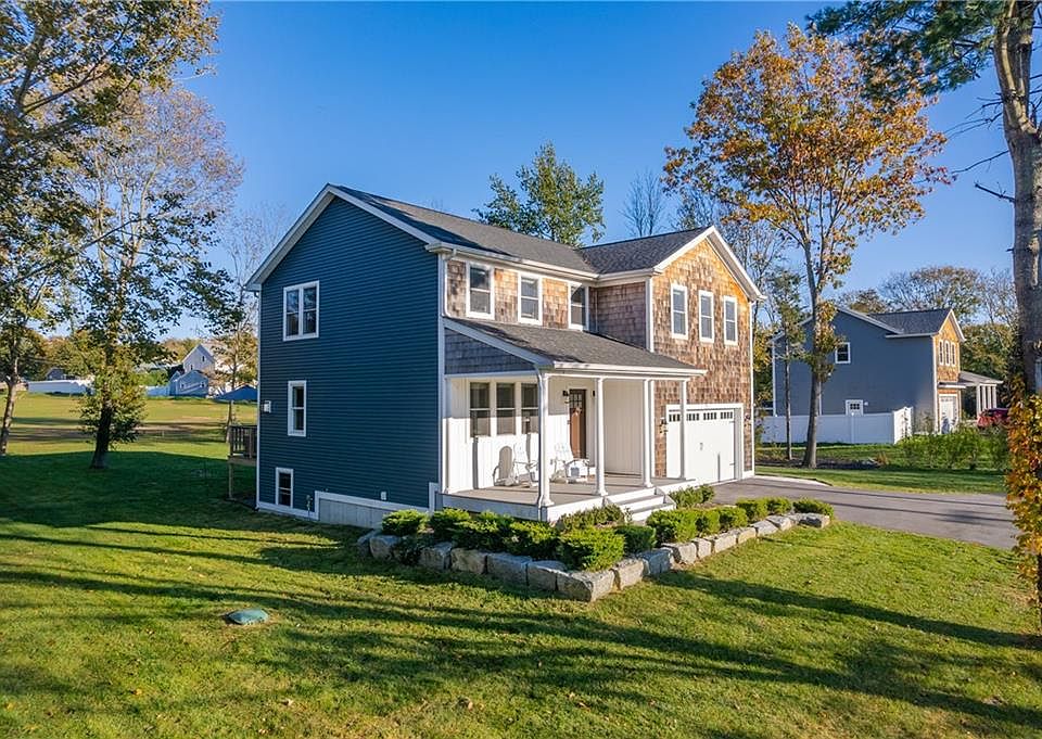Gorgeous 2022 build in Portsmouth, one of the East Bay's premier towns. The sweet front porch offers the charming entry of a vintage home, while the open-concept first floor is ideal for today's living. Sunny and inviting, you'll love the gas fireplace, large living room, and dining area, and all the counter space and kitchen island with seating. There's also a walk-in pantry and a full bath on the first floor. The integral 2-car garage is perfect for bringing in groceries on a rainy day. Upstairs are three more large bedrooms, a full bath, a separate laundry room, and a primary suite, making four bedrooms, with a walk-in closet and a huge en-suite bath with a walk-in shower and a double vanity. The full basement has tall ceilings and lots of windows along the back, a perfect spot for your media room, art studio, or home gym build-out. The lot is enormous, nearly 26,000 sq feet, and faces West, so you'll never miss a sunset! This home is completely turnkey and well-maintained. Only 20 minutes from Newport, the Naval College, and world-famous beaches - this is a great location for people looking to move to Rhode Island and settle in the East Bay. Only 10 minutes away is SouthCoast Marketplace, with grocery stores, retail, and restaurants.