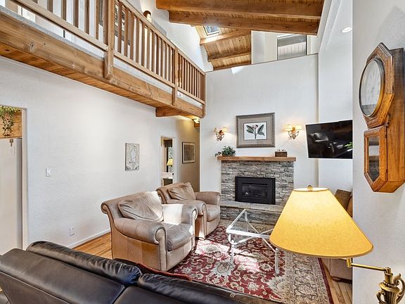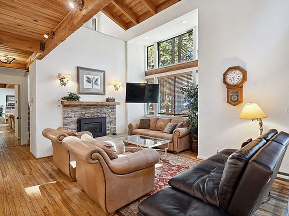 Tahoe living awaits in this end-unit Lake Village townhome, in Zephyr Cove, NV. 3 bedrooms, dedicated office space, & wraparound deck combine style & comfort. Vaulted wood-beam ceilings & abundant light highlight rich hardwood floors & an updated kitchen with granite counters, oversized island, GE Profile appliances (including an induction cooktop), ideal for culinary creations. The great room, with soaring ceilings & stacked stone fireplace, is perfect for relaxing & entertaining. The wraparound deck, with BBQ & hot tub, extends living outdoors for dining & starlit evenings. A bedroom deck adds more outdoor space while the workshop/storage enhances functionality.