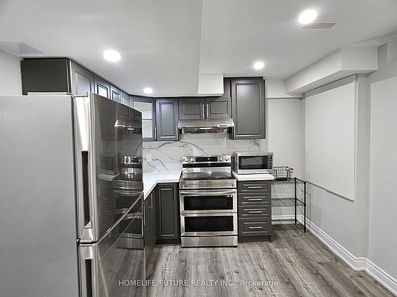 Private side separate entranceLarge windowsNatural lightBrand-new appliancesModern open-concept kitchenQuartz counter topGold trim finish