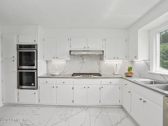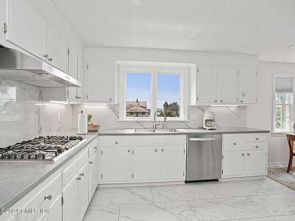 This single family home, with views of Long Island Sound, was completely renovated in 2020 - 3.5 bathrooms, new kitchen equipped with new appliances, new washer/dryer in separate laundry room, and refinished wood floors. The large living room with a fireplace flows to the dining room and eat-in-kitchen with sea views, and an additional family room downstairs with fireplace and wetbar. The spacious primary bedroom highlights; sea views, double closets, and an ensuite bathroom. Second large bedroom with separate stairs to the kitchen, an ensuite bathroom, and extra large closet. Two additional bedrooms with large closets, and fifth room excellent for an office/nursery/gym. Outside, a covered patio and large fenced in lawn perfect for entertaining and dogs. Downstairs approximate 450 sqft family room with stairs off the front entryway and access to outdoor patio includes a half bath and wet bar, perfect for entertaining guests. Home has ample storage space, with spacious closets throughout. This property is only a short quarter mile to Byram park, public beach, public pool, and marina. 2025-10-02