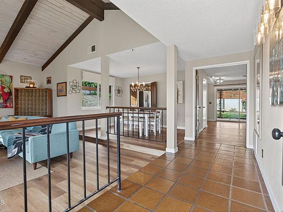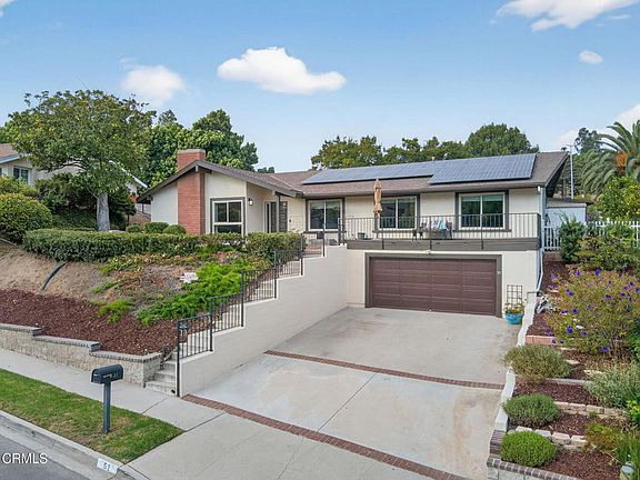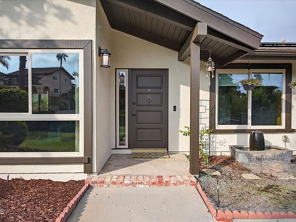 Rarely available in Camarillo's coveted La Entrada neighborhood, this 2,008 sq ft single-level 4BD/2BA hillside home sits on a 10,001 sq ft lot with privacy, treetop views, and a desirable south-facing orientation. Relax on the newly rebuilt front deck with mountain views and Camarillo breezes, just steps from Nancy Bush Park and a short stroll to Las Posas Plaza dining, shopping, and Starbucks. The thoughtfully updated ranch-style floor plan features a step-down living room with wood-beamed cathedral ceilings, a brick gas/wood-burning fireplace, and large windows that fill the home with natural light. Upgrades include a paid-for solar system, 2020 HVAC replacement, a newer higher-capacity electric water heater ideal for a large family, water softening system, stainless steel appliances, upgraded vinyl windows and sliding glass door, and all-new luxury vinyl plank flooring, carpeting, and baseboards. The exterior has been refreshed with paint, updated trim, block walls, railings, and landscaping with mulch, rock, and a fountain water feature. A two-car garage plus an oversized driveway provides off-street parking for up to six vehicles, while a versatile bonus space is perfect as a man cave, she shed, or artist studio. With proximity to Las Posas Country Club, this hidden-gem neighborhood is known for homes that rarely come on the market--and sell quickly.