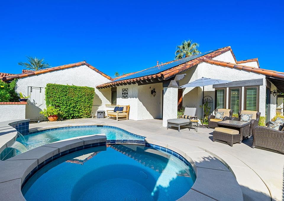 Freshly Updated and Move-In Ready!Completely repainted inside, this beautifully refreshed Mediterranean-style home in sought-after Casas De Sevilla offers the perfect blend of style, comfort, and energy efficiency. Situated on a quiet cul-de-sac with majestic mountain views, the home features three ensuite bedrooms, a chef-inspired kitchen, and bright, open living spaces designed for easy desert living.Enjoy year-round comfort with owned solar and dual-pane windows that enhance efficiency and peace of mind. Step through elegant glass doors into a spacious living area with a sunken living room, fireplace, and French doors leading to a private backyard retreat. The primary suite includes direct patio access, a large walk-in closet, dual vanities, and a sunken tub for relaxing after a long day.Outdoors, the sparkling pool and spa, built-in BBQ, and covered cabana create a resort-style setting perfect for entertaining. Casas De Sevilla features four pools, two tennis courts, and lush greenbelts, all just minutes from shopping, dining, and golf.A beautifully updated, energy-efficient home offering true desert living at its finest!