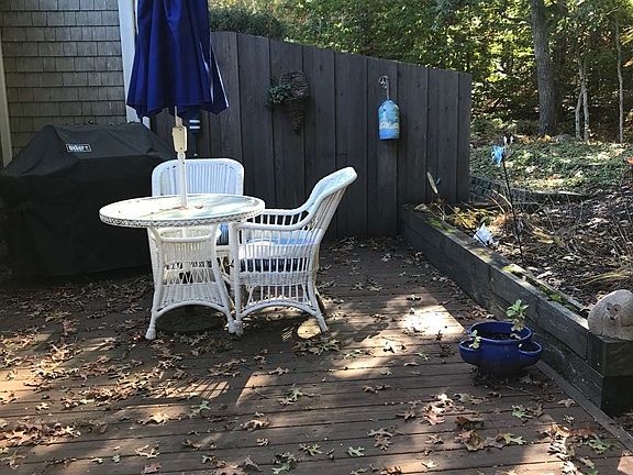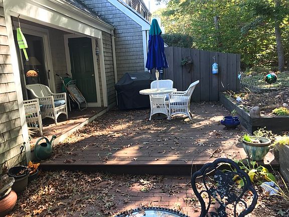 Sippewissett Hills End unit 2 Bedroom 3 full bath condo! On the Shining Seas Bike path. Move in condition 1 level living offers private deck and patio with lovely woods view and perrenial favorites! Vaulted living room with gas fireplace and sliders to deck. Open plan gives spacious feel. Updated kitchen with stainless appliances and granite counters. Soaring ceiling in primary bedroom with en-suite bath. Stacked washer/dryer main level! Lower level exercise room, full bath, full size washer/dryer, office and craft room! Well maintained!Open House viewing only!