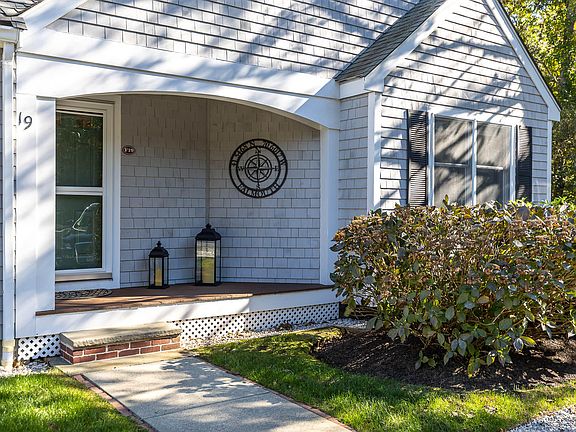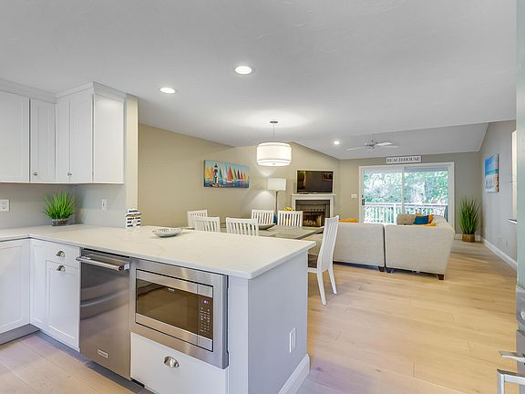 Magnificently renovated in 2020, this sunlit end unit in Sippewissett Hills provides a peaceful setting bordering on the Shining Sea Bikeway. The open floor plan offers a spacious kitchen, dining area and living room that is perfect for relaxing or entertaining. The kitchen consists of sparkling stainless appliances, a Carrara quartz countertop, and abundant white cabinetry. The living room includes a soaring ceiling height, a wood burning fireplace with a leather granite surround, and a large slider that leads to an expansive deck. The primary bedroom also has a vaulted ceiling, its own full bath with double sinks and a marble countertop. The second bedroom is inviting to guests who have access to the full bath located just outside in the hallway. Throughout the main level, stunning wide plank, engineered hardwood flooring with a light, natural finish covers the main living areas and both bedrooms. Downstairs in the finished, walk out lower level, you will find a storage room, laundry room, an additional guest space, and a sizeable room for entertaining and a workout area.