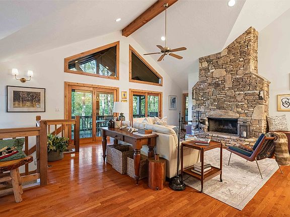 Step inside to an open-concept main level featuring a bright and inviting kitchen with stainless steel appliances, an eat-in dining area, and seamless flow into the living room. Cozy up around the wood-burning stone fireplace, the centerpiece of the main living space, perfect for chilly mountain evenings.