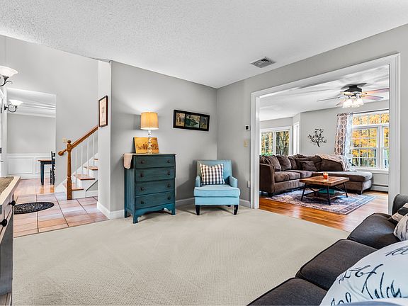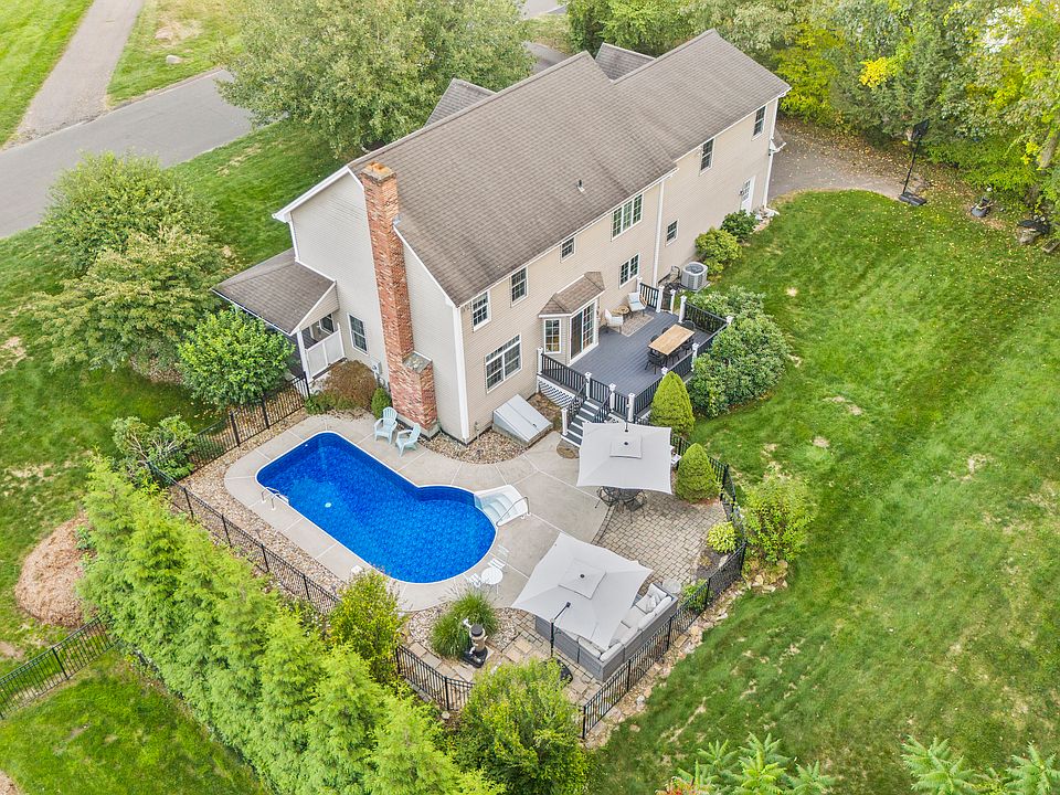 Tucked away on a quiet cul-de-sac just minutes from the highway, this beautiful 4-bedroom, 2.5-bathroom farmhouse colonial offers the perfect blend of comfort, style, and privacy. Step inside to a bright two-story foyer and discover a thoughtfully designed main level featuring a spacious kitchen with a center island, stainless steel appliances, and solid wood cabinetry. A new Trex deck just off the kitchen overlooks the fenced-in inground pool and patio, ideal for relaxing or entertaining. The inviting living area with gas fireplace opens seamlessly to the kitchen, while a formal dining room, separate sitting room, enclosed laundry room, and a remodeled half bath complete the first floor. Upstairs, you'll find four generously sized bedrooms, including a serene primary suite with a large walk-in closet and a spa-like bathroom featuring a soaking tub and separate shower. Recent updates include a new deck, front porch, pool fencing, pool liner, oven range, remodeled half bath, well pump, and washer and dryer making this home truly move-in ready. The full, unfinished basement offers high ceilings and endless potential for additional living space or a recreation area. A 2-car garage provides convenient parking and storage. Set against the scenic backdrop of Fish Farm's wooded land, this home combines a peaceful country feel with modern amenities and convenience. This beautiful home is an ideal choice for anyone seeking more space in a beautiful setting.