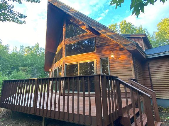 This gorgeous chalet style home sitting on 5.08 surveyed acres is waiting for the next owners to call it home. From coming up the country road to up the driveway to the spacious yard with apple trees, this property is beautiful. Walking in the door is an entry way with closets, a hallway leading to the main floor bathroom and separate laundry room. The kitchen has ample cabinets, an island and has an archway to the dining room. The grand living room has stunning high exposed wood cathedral ceilings, a floor to ceiling brick chimney acting as the centerpiece of the home opposite the chalet wall of windows. Cozy nights by the woodstove watching it snow or go onto the deck to relax. The sellers had a view of the mountains in years past which may be possible again with some tree work. The main floor also has two bedrooms with closets. The staircase winds behind the chimney to the primary suite upstairs. This home has undergone several renovations recently including a new roof, the heating system has been gone through and parts replaced, some electrical repairs and a recent survey.