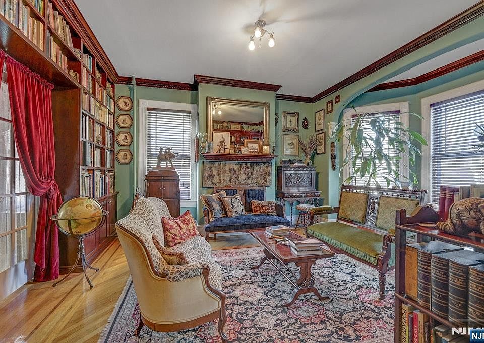 A turn of a Diamond-like doorknob reveals a stately 1900s historic Victorian nestled in Rutherford's town center. The side-hall foyer is illuminated by sunlight filtering through a Tiffany window. A fairytale library with bay window, and built-in shelving beckons book lovers. French Doors lead to a formal living room w/ high windows and Victorian-style treatments. Enjoy fine dining in the oversized dining room featuring built-in display cases. The modern kitchen boasts a ceramic tile floor, an oversized island with a granite countertop, stainless steel appliances, and ample cabinetry. The first floor includes a full bath, pantry, and addition that can serve as a bedroom or great room. Ascend the Grand staircase to find 5 bedrooms and a second kitchen option. The finished attic offers a bonus room and a ceramic-tiled bath w/ a marble vanity. Additional storage is in the full basement. Parking for up to 6 cars is available. Town approval allows conversion back to a 2-family dwelling.