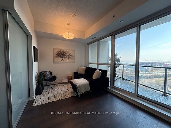 Liberty Village Living at Its Finest ~ Experience elevated urban living in this impeccably designed 1-bedroom suite offering 507 sq ft of interior space plus an 85 sq ft open southwest-facing balcony with breathtaking lake and skyline views.Warm walnut-toned wide-plank laminate flooring flows throughout, setting a rich and elegant tone. The open-concept living and dining area is anchored by a striking slate grey accent wall, creating an intimate, upscale setting perfect for stylish entertaining, quiet dinners in or the best brunch in the city and no waiting in line.The sleek European kitchen is both beautiful and functional, featuring stone countertops, modern cabinetry, and a full appliance package. Soaring floor-to-ceiling windows bathe the suite in natural light outfitted with custom window blinds, enhancing its airy sophistication.Retreat to the spa-inspired bathroom with a glass walk-in shower, and enjoy the convenience of a large ensuite laundry room that doubles as a storage and closet space a rare urban luxury. The private bedroom features dual sliding doors and a double closet, maximizing both style and utility.Unparalleled 5-star amenities await: rooftop pool & hot tub, lap pool, fitness centre, sauna, party room, resident lounge, and 24/7 concierge & security.All this in the heart of vibrant Liberty Village, just steps to the lake, 24-hour TTC, shops, cafés, and dining.Effortless luxury, stunning views, and a location that has it all. This is the one!
