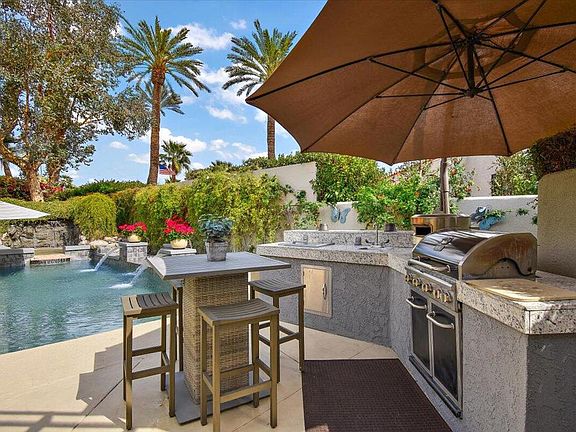 Welcome to this luxury desert oasis in the prestigious gated community of Mission Pointe. This stunning home offers the perfect blend of elegance, comfort and resort style living. Step inside the front gate to a delightful courtyard which you can relax and enjoy the mountain views. Once inside you will be awed by the expansive entryway with soaring ceilings leading to the gourmet kitchen which includes commercial grade stove and oven, a perfect gift for the cooking enthusiast, light filled great room which also includes a stylish bar area, ideal for entertaining. This home features 3 spacious bedrooms, which includes the luxurious primary suite. Large walk in closet and additional closets, a dream for the clothing enthusiast. Recent upgrades include newer HVAC, solar, new electrical panel, new skylights and dishwasher ensuring an energy efficient home. Outside your private backyard paradise awaits. Enjoy the sparkling pool and spa with grotto, practice your putting and fire up the built in BBQ. Expansive lounging area makes this oasis a prime spot for enjoyment and relaxation. This home is just minutes from world class golf, tennis, dining and shopping. Low HOA offers access to a private gym, tennis, and pickleball courts Don't miss this great opportunity to own this exceptional desert retreat.