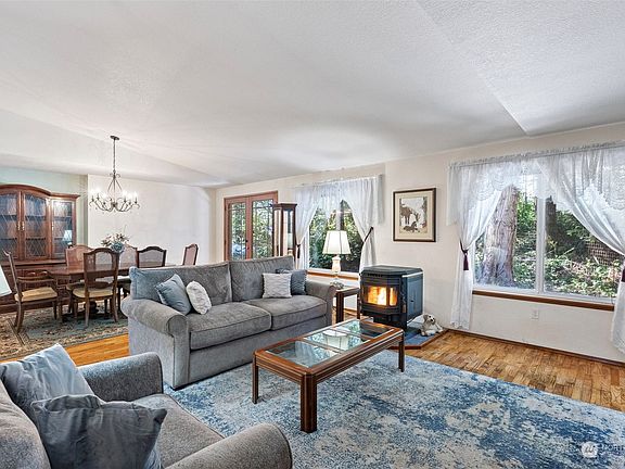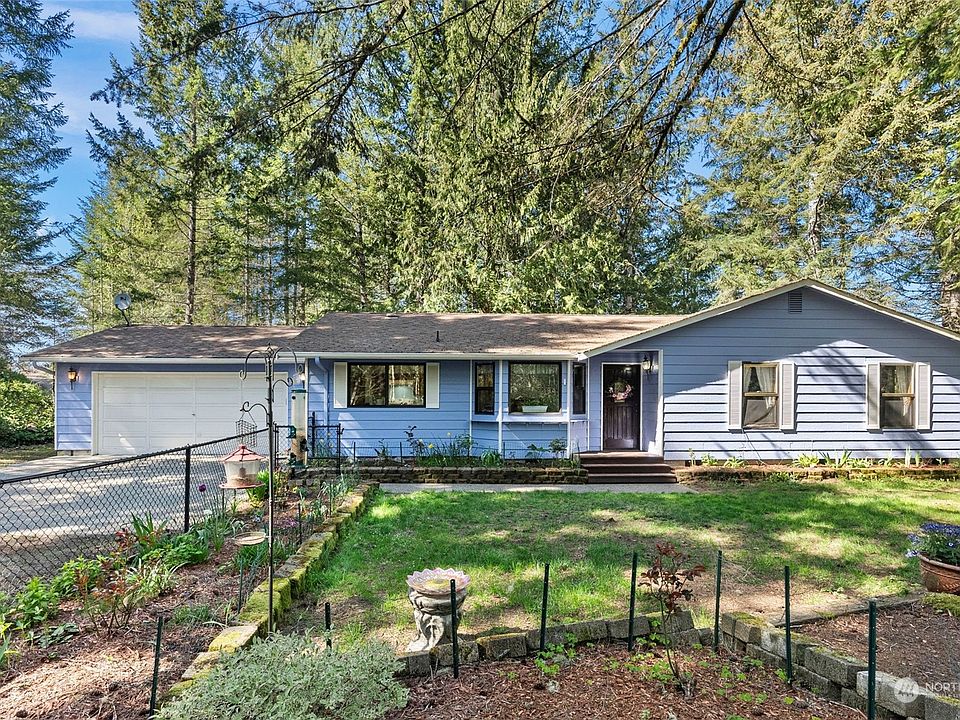 Quiet country charm abounds in this 3 bedroom 1.75 bath one story home on 1.32 acres near Hood Canal. Enter to hardwood flooring throughout and cozy living room with efficient pellet stove. Full dining space leads to secluded back deck for grilling or watching for wildlife. Kitchen with updated quartz counters and full eat-in space. Generous primary bedroom with en-suite bath. Peaceful yard is fully fenced and includes garden beds and water feature in front yard. Attached two car garage and plenty of parking for boats or RVs, as well as guests.