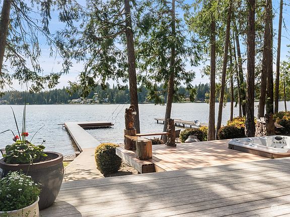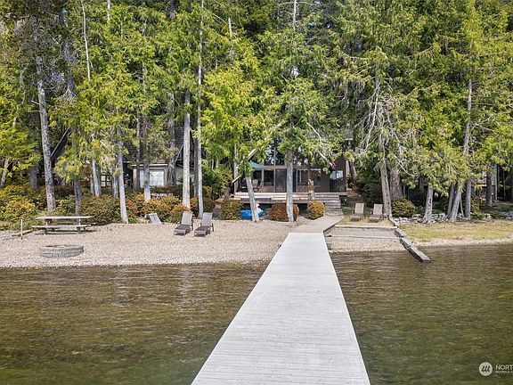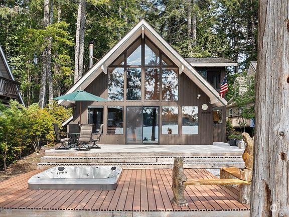 Fabulous sunsets and 180 degree lake views are the hallmarks for this west facing no-bank, pea gravel beach Mason Lake waterfront retreat! Soaring, light filled, open concept interior features vaulted wood and beamed ceilings, large modern custom kitchen, 3 bedrooms, 3 baths plus extra loft and sleeping area for overnight guests. Cozy woodstove, waterside decks, storage building. Hot tub at lake's edge, perfect beach for swimming, firepit and large modern dock. Located on a quiet side street and includes access to Paradise Shores Estates park & sport courts and recreational facilities. Enjoy water skiing/jet skiing, wakeboarding, fishing, sailing, or just enjoy a beverage under the sunset!