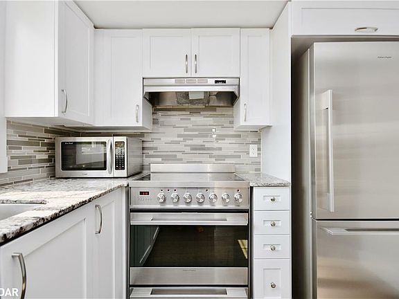 Welcome to this beautifully renovated split-level condo, nestled in the sought-after Ardagh Bluffs area of South Barrie. Perfectly located near shopping and Highway 400, it also offers nature enthusiasts 17 km of scenic walking trails across 518 acres of protected land. This modern unit is filled with natural light and features a spacious open-concept living/dining area, a sleek kitchen with granite countertops and high-end appliances, and a stylish main floor laundry with a wood sliding door. The fully renovated main bath boasts a quartz topped vanity. The primary suite impresses with custom wall-to-wall closet cabinets, while the bright second bedroom occupies the top level. With 1.5 baths, recent upgrades like laminate flooring, pot lights, fresh neutral paint, and upgraded trim, this move-in ready gem is a must-see!