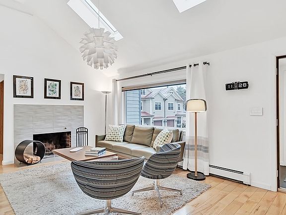 Renovated contemporary four bedroom, two bathroom attached single family ($0 HOA condominium) located in the heart of Newton Centre on the corner lot of a private dead end street. Sun-drenched living room features high vaulted ceilings, two skylights, and a wood burning fireplace. Chef's kitchen with skylight, quartz counter-tops, gas stove, stainless steel appliances, and marble floors. Main level includes a mudroom, three bedrooms, elegant bathroom with Kohler fixtures, dual vanity & glass enclosed shower, dining room with patio access, central A/C, and hardwood floors throughout. Finished lower level includes an additional living area, bedroom, full modern bathroom with a deep tub and dual vanity, storage room with closets, laundry room with sink, utility room, and attached one car garage. Property has two additional outdoor parking spaces, private manicured yard and patio. Perfectly positioned by Webster Woods, the Green Line, and Newton Centre & Chestnut Hill amenities.
