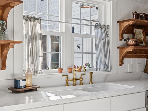 Center islandAntique cookstoveWide-plank floorsBright roomsMajestic center chimneyColonial style treasureNew stainless appliances