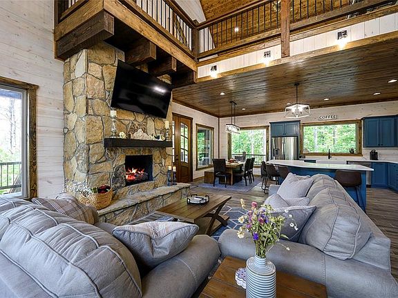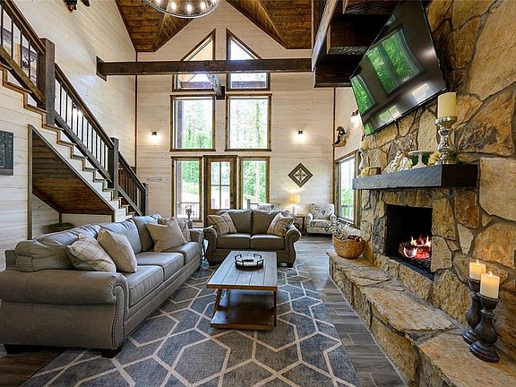 Bear’s Lair is a newer luxury cabin with a touch of modern and a touch of rustic design. Bear’s Lair is located on paved roads with a paved driveway so no need for off-roading to get here! There is also room to park a boat along the side and an EV charger for Teslas and the like! As you enter the main entrance the massive fireplace draws you into the open concept of living and dining experience