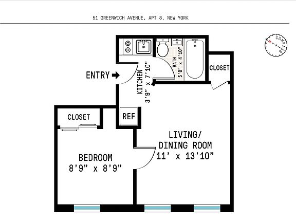 Sunny, quiet, and renovated 1-bedroom apartment on Greenwich Avenue between Perry and Charles Streets. Located in a well-maintained walk-up building (two flights up), featuring a queen-size bedroom, spacious living room with two windows facing beautiful tree-tops, great light throughout, two large closets, high ceilings, a pass-through kitchen with stainless steel appliances, convection oven/microwave, two gas burners stovetop, and a full-size refrigerator. The bathroom has new tiles and a tub with a glass enclosure. Sorry, no pets. Avaiable September 1, 2025
