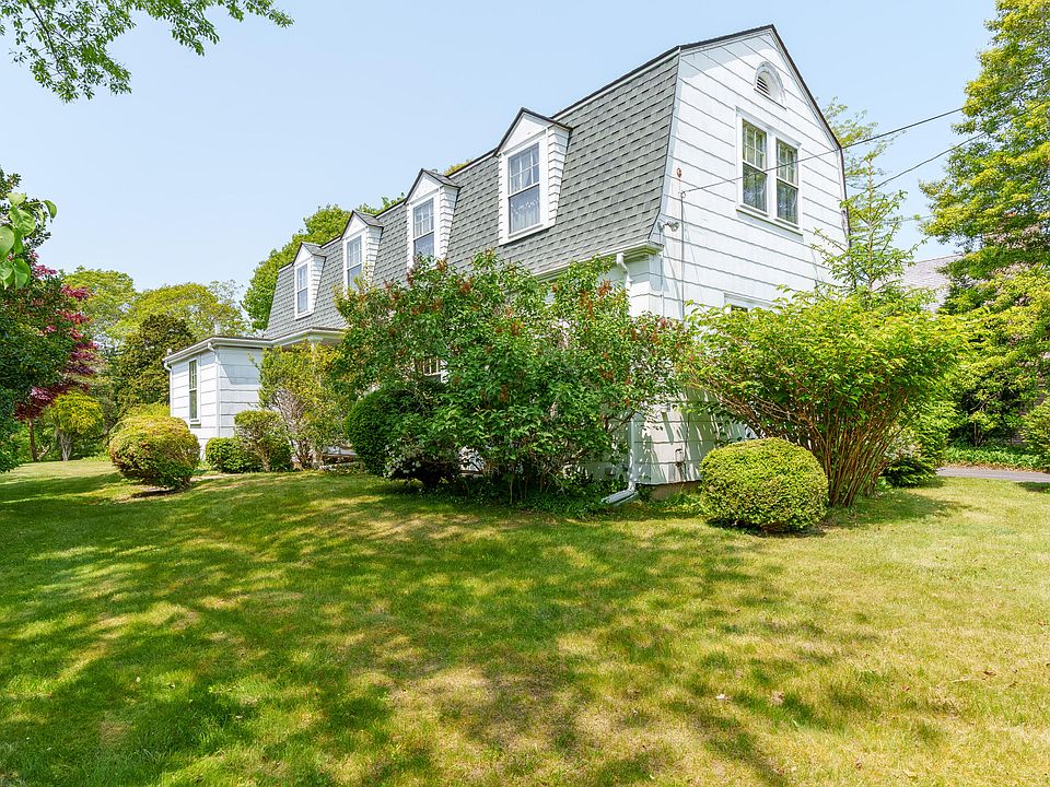 Enjoyed by the same family for over a half century this charming Gambrel is privately sited on just under a half-acreproviding sufficient room to add a guest house with town approval. Remarkable features include a gracious living roomenhanced by a large fireplace framed with Delft tiles, a wall of custom bookcases, a beamed ceiling and dining area. Thefully applianced large kitchen awaits your touches. A guest bedroom with ensuite bath completes the first floor. Threelarge bedrooms, one with ensuite bath, and one bath shared by two of the bedrooms, provide for family and guests. Thedetached two-car garage and storage area will readily accommodate all of your boating, sports and gardening equipment.The neighborhood beach and access to the outer harbor is across the street. Exclusive $2,700,000.