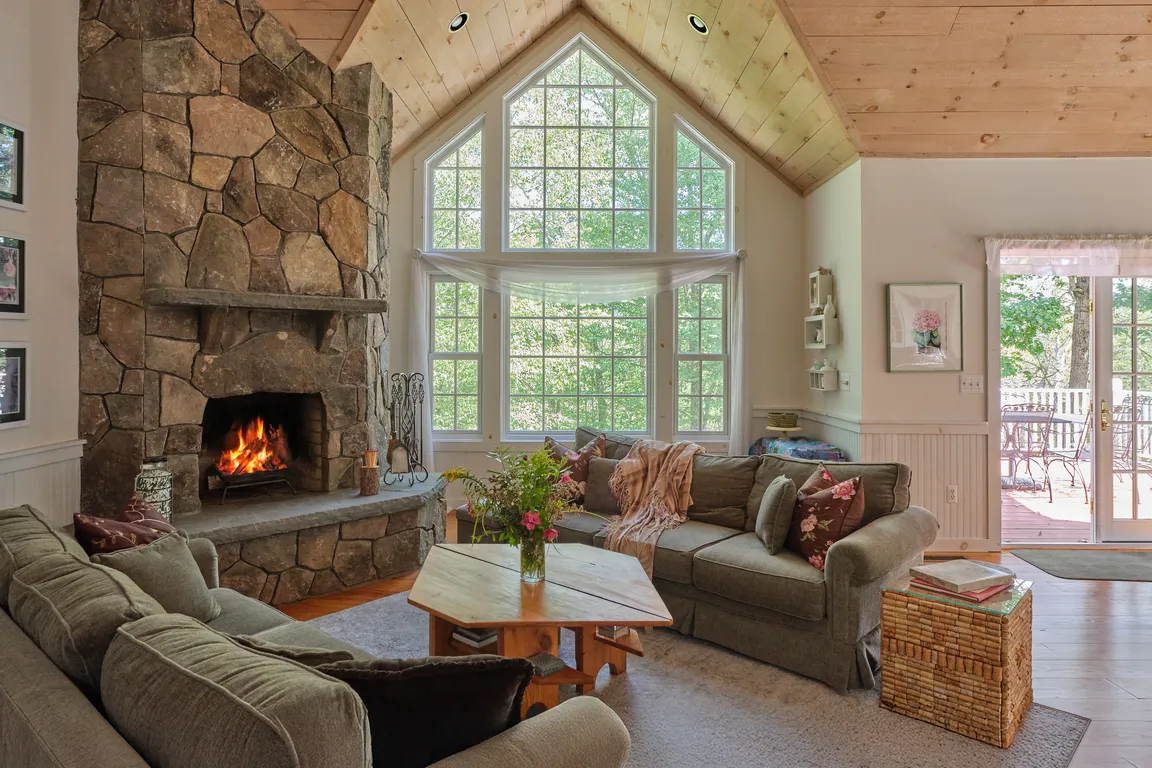 - First Floor Bedroom, First Floor Full Bath, Beamed Ceilings, Built-in Features, Cathedral Ceiling(s), Ceiling Fan(s), Chandelier, Double Vanity, Eat-in Kitchen, Entrance Foyer, High Speed Internet, Kitchen Island, Natural Woodwork, Open Floorplan, Open Kitchen, Original Details, Primary Bathroom, Recessed Lighting, Sauna, Soaking Tub, Speakers, Wired for Sound