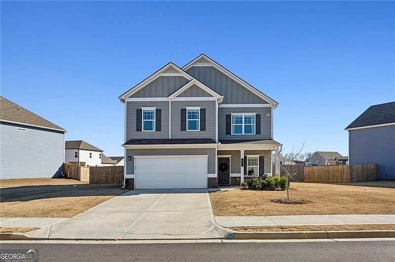 Don't miss this newer construction home on a premium lot in the swim community of Jackson Farm! This traditional home greets you with a charming covered front porch. The open-concept floor plan features a spacious living area with fireplace that seamlessly flows into the kitchen and dining area. The kitchen has granite counters, gas appliances, and an oversized island. The main floor also includes an additional office with French doors and a convenient powder bath. Upstairs, you will find four bedrooms including an oversized primary suite with a walk-in closet and luxurious bath with both a shower and a soaking tub. Step outside to enjoy the covered patio and fully sodded, fenced yard. Additionally, all lighting, fans, faucets, and cabinet hardware have been upgraded from the original purchase. Save the headache of building and move right in!