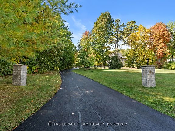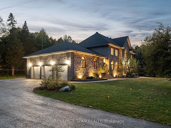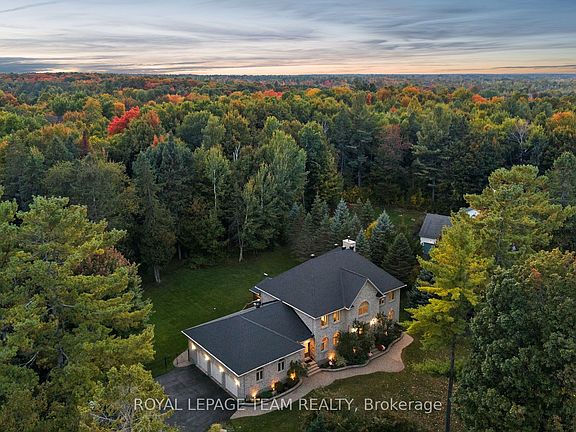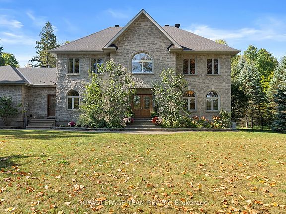 Set on a winding drive and surrounded by mature trees, this full-stone executive residence offers both presence and privacy in a truly natural setting. Built in 2000, the 2-storey design blends timeless elegance with thoughtful updates across approximately 4,100 sq ft above grade (MPAC), set on 2.47 acres. A grand double-door entry opens to a tiled foyer and freshly painted interiors, where 9 ceilings, refinished hardwood flooring, and California shutters create a warm welcome. Formal living and dining rooms provide ideal spaces for entertaining, while the sunken family room with pillars and wood-burning fireplace is perfect for everyday gatherings. The 2024 Deslaurier kitchen is a true highlight: Sub-Zero/Wolf appliances (fridge, induction stove, microwave, wine fridge), custom cabinetry, quartz counters, large island with seating for 6, prep sink, pot lights, and undercabinet lighting. French doors lead to a screened porch with vaulted ceiling - a year-round favourite. Upstairs, hardwood flooring continues, with a spacious primary retreat offering a gas fireplace, custom walk-in cabinetry (2023), and a spa ensuite with soaker tub, dual vanities, heated floors & towel rack. The updated main bath (2018) also features custom finishes, heated floors & towel rack. A mudroom with new laundry (2025) connects to the oversized 3-car garage. Lower level unfinished with painted floors (2025). Systems: Generac 20kW generator (2021), tankless HWT owned (2023), AC (2022), 200 amp, Starlink internet, security cameras. Roof (2018), garage roof (2016), 12 windows replaced (2019-2020), driveway (2021, resealed 2025). Landscaped lot includes fenced yard with natural backdrop beyond. All this just 10 min to Tanger Outlets & 9 min to Kanatas High Tech hub -convenience meets country charm. 24 Hours Irrevocable preferred on all offers. Some images are virtually staged.