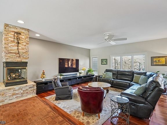 Welcome to this light-filled end unit offering a beautifully maintained living space. This spacious home features 2 bedrooms, 2.5 baths, two double-sided gas fireplaces, skylights, updated bathrooms, a second-floor laundry room, tastefully finished ground level, and an oversized one-car garage. Designed for comfort and flexibility, the home offers a family room, living room, and generous recreation room perfect for spreading out, entertaining, or work-from-home needs. The inviting kitchen boasts high-end cabinetry, granite countertops, tiled backsplash, and sunny breakfast area that opens to a private deck. One double-sided fireplace warms both the living room and adjacent family room, while the second adds ambiance to the primary suite. The primary suite impresses with vaulted ceilings, a separate sitting room, skylights, and an updated bath featuring a soaking tub and separate stall shower. The lower level offers high ceilings, a spacious recreation room ideal for a media or game setup, and an office/guest room. Recent upgrades include a new HVAC system (2018) with upper-level splits, a new roof with skylights, and a new refrigerator and hot water heater. Ideally located atop Garret Mountain, this home offers the perfect blend of tranquility and convenience. Commuting to NYC is easy with multiple options nearby. You'll also enjoy the convenience of three supermarkets nearby, along with close proximity to Montclair's renowned dining, shopping, and major roadways.