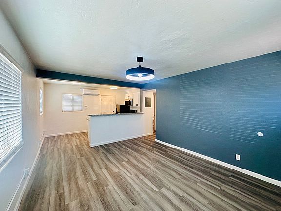 This modern 1 bedroom, 1 bathroom apartment features vaulted ceilings, hard flooring, and plenty of natural light. The spacious living area includes an accent wall and modern light fixtures, creating a stylish and inviting atmosphere. The kitchen is equipped with a microwave and double pane windows, while the bathroom boasts a tiled walk-in shower. With a washer/dryer, large storage closet, and mini splits for efficient heating and cooling, this apartment has everything you need for comfortable living.