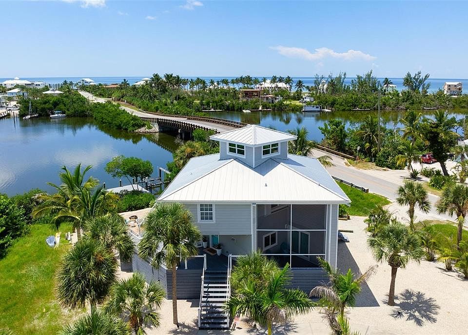 Welcome to Palm Island - Where Old Florida Charm Meets Waterfront Elegance. Discover a timeless coastal haven on Palm Island, where the gentle rhythm of the waves and the salty breeze create a serene backdrop for everyday living. This fully furnished elevated retreat captures the essence of the Florida lifestyle with quiet, shell-lined beaches, abundant wildlife, world-class fishing, and direct boating access from your private dock, featuring a 10,000-pound lift and a cozy seating area just outside your back door. With no bridges between you and the Intracoastal Waterway or the Gulf of Mexico, your boating adventures begin effortlessly. Inside, the home offers 3 spacious bedrooms, 3 full baths, and a versatile loft ideal for a home office or den. The downstairs guest suite includes a private ensuite bath, while the second level reveals a sunlit loft with sweeping water views. The primary suite is a tranquil retreat with its own generous bath, and an additional guest bedroom is conveniently located near a full bath. Step outside to the expansive lanai, where multiple seating areas and umbrellas invite you to relax and take in the breathtaking vistas of historic Bocilla Pass. Vaulted ceilings with exposed beams and floor-to-ceiling glass doors fill the open-concept living space with natural light, creating a seamless indoor-outdoor flow perfect for entertaining or quiet reflection. Below the home, a shaded gathering space offers yet another venue for hosting friends and family. With impact-resistant glass, hurricane shutters, and a host of thoughtful upgrades, including a new metal roof installed in 2021, this home blends durability with coastal sophistication.