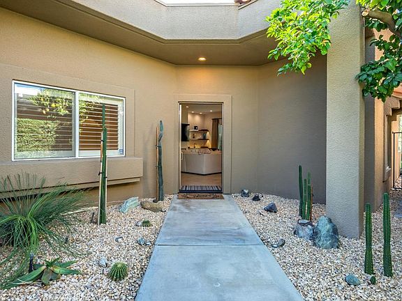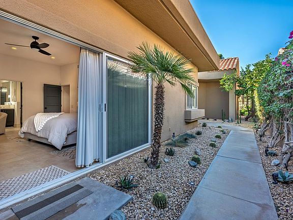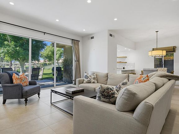 Located behind the guard gates of Mission Hills Country Club this beautifully updated condo blends rich finishes with timeless touches. Whether you admire the solid core doors throughout or the redesigned primary bath this home offers a stylish retreat with mountain views embraced with luscious trees. The interior bares clean lines and open spaces, featuring an inviting floor plan designed for both relaxation and entertaining. Updated finishes and rich accents give the home character, while large windows allow natural light to pour in, framing picturesque views. The living room and dining areas flow effortlessly, creating an airy feel throughout. The wet bar offers convenience while the fireplace provides warmth. The kitchen is stylish and functional, outfitted with quartz countertops, designer backsplash, quality cabinets and ample storage. The home offers 1,806 sf, 3 bedrooms, 2 bathrooms and a 2 car garage plus golf cart with epoxy flooring & cabinets, creating a desirable desert living experience in the exclusive Mission Hills Country Club community.