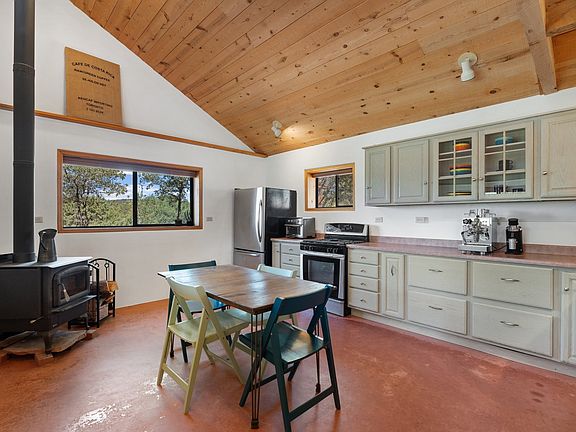 Welcome to your magical hideaway that directly borders the Santa Fe National Forest—just 15 minutes from the iconic Harry's Roadhouse, yet a world away from the bustle of everyday life. Nestled among towering ponderosa pines, this serene and secluded passive solar cabin offers the perfect balance of rustic charm and modern convenience. A well maintained trail system for hiking, mountain biking, and horseback riding begins only about 1,000 feet from the front door, putting adventure quite literally at your doorstep.