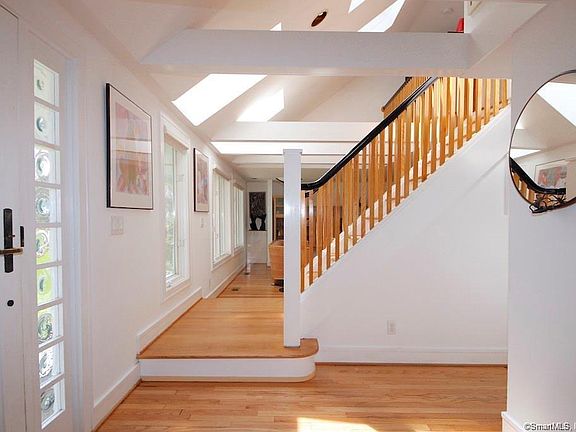 Looking for sunsets over the water in private association w beach and out of flood zone? Look no further: Post Modern Contemporary Cape in Rowayton's sought after Pine Point Assoc. neighborhood! Incredible western sky and water views from over-sized deck surrounded by open sky. Beamed and vaulted ceilings add to fine architectural character of this home. Enjoy entertaining in spacious living/dining room w fireplace, or relax in family room off kitchen with access to deck. 1st fl office could be converted to 4th BR or nanny suite. 2nd floor master offers lovely balcony w water views for coffee or cocktails. Attached 2 car garage, finished LL, double lot and multi million dollar area. Walk to beaches, tennis, village, school, library, dog park. 60 min NY. Make it yours!