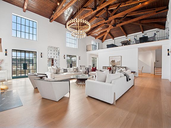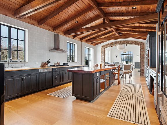 Imagine yourself in the sun-kissed beauty of Sagaponack, one of the Hamptons' most sought-after destinations, as you step into this stunning 3.5-acre estate overlooking Poxabogue Pond. This home offers 6,500 square feet of living space, highlighted by 25-foot double-height, wood beam vaulted ceilings that frame the living room, kitchen, and dining areas. The living room features a custom stone fireplace, double-height steel-framed glass windows and doors, a wet bar, and a separate sitting area. Above, a loft includes an office/den and a Peloton. French doors lead out to a spacious outdoor stone terrace with a glass-covered pergola, perfect for enjoying the summer evenings. The dining room, complete with a fireplace, flows into a kitchen designed for entertaining. Equipped with top-of-the-line appliances including a Sub Zero refrigerator, Miele dishwasher, Wolf double ovens, and a Viking six-burner stove. A well-appointed pantry with a freezer, dishwasher, and additional sink ensures effortless entertaining. Step outside into a courtyard with a pergola, where the expansive grounds and pool. The primary bedroom features a wood beam vaulted ceiling, a fireplace, and two walk-in closets. An additional en-suite bedroom is nearby. On the other side of the house, two more bedrooms offer ample space, while the fifth bedroom suite on the second floor includes a balcony with pond views. With an oversized two-car garage and proximity to Bridgehampton and Sagaponack's ocean beaches, this estate embodies the quintessential Hamptons summer experience-where every day feels like a celebration of luxury and tranquility.