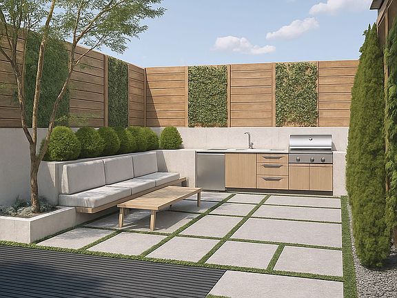 Townhouse B, an expansive 1,666-square-foot two-bedroom, two-and-a-half-bath garden triplex, embodies townhouse living in a new development. On entering, you’re greeted by the breathtaking scale of the living room. With ceilings rising to 20 feet, the room unfolds as an impressive expression of height and luminosity. Sliding glass doors flood the space with sun-washed ambience throughout the day and extend the living area onto a backyard deck. At over 800 square feet, the garden is designed for both quiet relaxation and vibrant entertaining. Integrated seating creates an inviting atmosphere, while an outdoor kitchen with a built-in BBQ and prep station makes al fresco dining effortless.