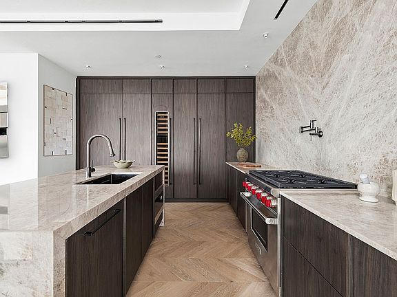 European white oak chevron flooring sets a refined tone throughout the entertaining areas, establishing a seamless sense of flow from room to room. At the center of this home is a premier Nolte German kitchen anchored by an island covered in full-slab Taj Mahal stone. Custom millwork discreetly conceals a Sub-Zero refrigerator and wine storage, while a Wolf gas range, wall oven, Cove dishwasher, and speed oven create a chef’s dream setup. Convenient storage keeps every appliance within easy reach and neatly out of sight.