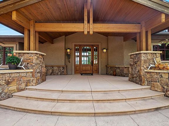 Stone fireplaceStone workVaulted ceilingsAdditional seating areaOutdoor seating areaCovered and uncovered areasCovered entry