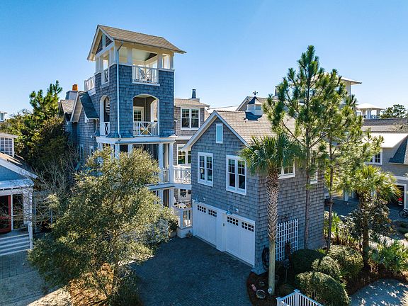 As you walk thru the dunes of Watersound Beach 51 Shingle Ln sits on the edge of the Dune Ridge overlooking the conservation area leading to the beach. The Tower's double deck sits proudly collecting breezes and sunsets. Created as the Coastal Retreat of a family whose roots gather friends and family from all corners it provides all you need to make memories and capture the gifts the Beach provides. The center of the home is a large gathering room with a soaring vaulted ceiling and a magical artistic chandelier lighting the space. Anchored by a gourmet kitchen with room for many cooks and a corner gas fireplace to warm and welcome all. This is the Dream Beach Home you have been looking for. This 6 BDR, 6 Bath Home has everything, heated pool, elevator, Carriage House, and so much more! The tower with 4 open porches greets you and invites you to partake in all this grand beach cottage has to offer. You enter thru the first floor screened porch to the first level casual den where guests and friends can visit. You will also find on the first floor two bedrooms with their ensuite bathrooms, a bunkroom, laundry room, wine closet with 2 wine coolers, and the hall that leads to a large glass paned door leading to the boardwalk that takes you to the dunes and the one mile of private beach frontage of Watersound. The stairwell here guides you to the heart of this special home surrounded by windows bathing every corner of the room with light that bounces off the architectual beams that support the 20 ft vaulted ceilings. Your eyes soar taking in the space anchored with a gourmet kitchen with a 12ft island, cabinets everywhere, high-end appliances with every luxury you can imagine including a Wolf steam oven, two dishwashers, 2 refrigerator drawers, icemaker, wine cooler, trash compactor and warming drawer. This kitchen has it all! The living room has 2 seating areas. One is centered around the large TV and the other the corner gas fireplace. French doors lead to a wide 2nd floor deck with an outdoor fireplace that overlooks the boardwalk to the beach. The room fills easily with friends, food, joy, and laughter. On the second floor the elevator is located directly beside the kitchen and across from the pantry for easy delivery of the groceries to their appropriate place. As you head to the rear screened eating porch you pass a 2nd large laundry room and another guest bedroom and bathroom along with the powder room for guests. The eating porch overlooking the pool with its grill and large table gives additional dining space for guests and family to break bread.