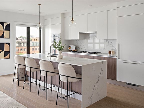 This stunning 3-plus-bedroom Penthouse offers the ultimate in high-end finishes with an ideal floor plan featuring 2 private outdoor spaces, 2 SUV GARAGE PARKING spaces, and ELEVATOR access to your front door. The chef's kitchen boasts Scavolini cabinetry, quartz waterfall countertops & Thermador appliances. A spacious open-concept living and dining area provides the perfect setting for relaxation or entertaining, with a conveniently located private balcony. The primary suite features a walk-in California Closet and an extravagant bathroom with a floating double vanity, back-lit frameless mirrors, and an oversized shower with floor-to-ceiling Porcelanosa tile. Upstairs, find a sun-filled head house with a wet bar and beverage fridge, with access to an expansive, private roof deck, complete with cable, electricity, gas, and water. The head house is a perfect space for a fitness area, office, or reading nook. Urban convenience meets calming retreat in this thoughtfully designed home.