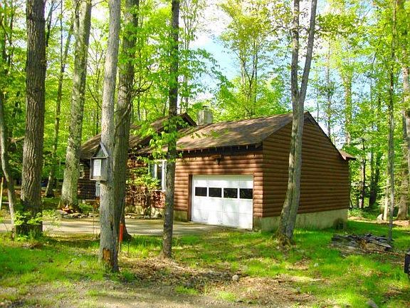 Sunny Point Log sided Chalet Includes BOAT SLIP on Lake Wallenpaupack. 3rd Tier EASY WALK TO water play. Hand crafted and Updated for year round living, 2 bedrooms PLUS Loft, (master with double closets and laundry)Open kitchen dining, Living room stone fireplace, Latch hook doors and some knotty pine walls, hardwood floors, Cathedral ceiling, Private Sundeck relaxation, attached 1 car garage with attic storage for the toys. FIRST TIME OFFERED!