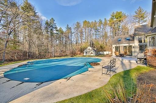 Located in desirable Boxford, this stylishly contemporary Colonial is perfect for the modern pleasures w/the sophistication of rural living. Perfectly situated among an oasis of mature wooded trees in a well established neighborhood; this home is true elegance enveloped in sunlight & comfort. Enter into the foyer and notice the open flr plan w/cth ceilings, hwd flrs, wainscoting and freshly painted throughout. The kitchen has a center island w/granite countertops, wood ceiling, lrg picture windows and a separate eating area that flows into the fireplaced FR. Enjoy the 4-season sunroom overlooking the pool w/a lrg deck. A formal living rm, DR, office, laundry rm & 2 separate entrances leading to the partially finished bsmnt & 3-car gar completes the 1st flr. The 2nd floor has a lrg mstr bd rm w/bath & a walk-in closet, 3 additional BRs & a staircase leading up to extra living space. The exterior has meticulous lndscp grounds w/a stable for the equestrian lifestyle you've always dreamed.
