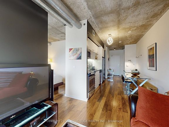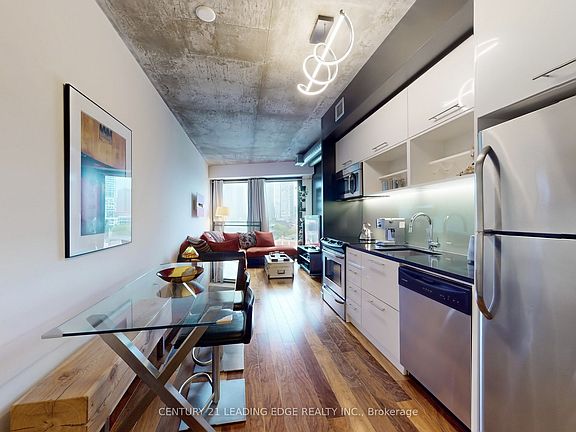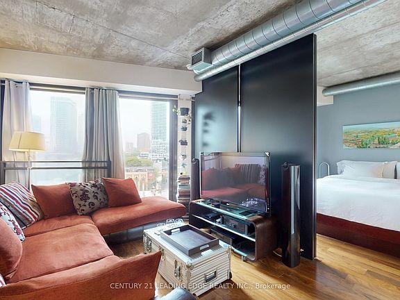 STUNNING Loft Style Condo! This bright and sleek 1-bedroom suite offers unobstructed panoramic city views and a bright, open-concept layout with 583 sq. ft. of interior space + A Balcony. The Large Bedroom Easily fits a king-sized bed, boasts a spacious walk-in closet, and offers direct access to the balcony for a relaxing moment overlooking the city! Industrial-chic finishes include 9ft exposed concrete ceilings, galvanized spiral ductwork, floor-to-ceiling windows, and carpet free floors throughout. The modern kitchen features sleek quartz countertops and stainless steel appliances, perfect for entertaining or everyday living! Located just steps to the Distillery District, Leslieville, St. Lawrence Market, Corktown Common Park, and scenic bike trails. Be ahead of the curve - steps to the future Corktown & Riverside/Leslieville Ontario Line stations! Don't miss the Gorgeous Pool, Gym and Multiple Party Rooms as well!