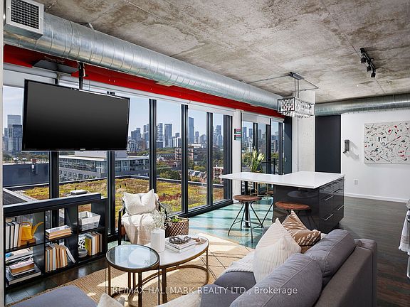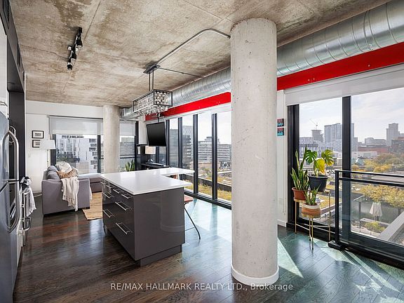 This 2 bed, 2 bath corner loft (1000 sq. ft.) is all about light, style, and skyline. With exposed concrete, 9 ft. ceilings, and south west facing floor-to-ceiling windows, every room is drenched in natural light and framed by epic city views. 4 balconies (incl. 3 juliettes) extend your living space and bring the outdoors in. Open concept kitchen features a sleek white glass backsplash, stainless steel appliances, and a custom island - perfect for entertaining and everyday living. Ideal split bedroom layout offers 2 generous bedrooms, updated baths, plus tons of built in storage. The second bedroom has fabulous black glass closets, ideal as a full bedroom, home office, or open it up as a den. Extras include parking and ensuite laundry (new washer&dryer). LEED certified building boasts top tier amenities: gym, outdoor pool, BBQ area, and stylish party room. Minutes to Corktown Common, the Distillery District, Leslieville, and St. Lawrence Market. Steps from shops, restaurants, parks, and TTC with easy access to the DVP and Gardiner. Bright, functional, modern, with a view you'll love.