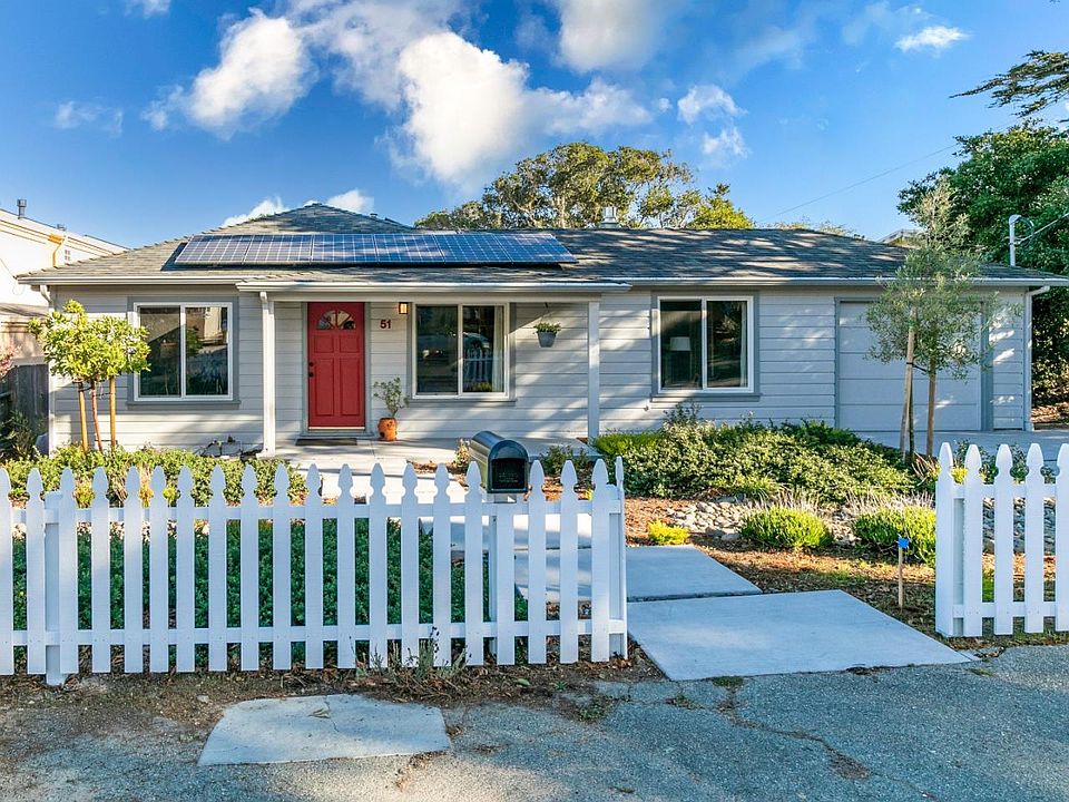 Perfect home as is or use available plans for an addition. Located in sunbelt area of Monterey close to Via Paraiso Park, walking distance to shopping and library this charming three bedroom home is in move-in condition. Refinished hardwood floors and a wonderful sun filled living, dining, family room area with a newer gas fireplace welcome you. Perfect for entertaining with open floor plan and large windows. A level, oak filled back yard awaits your gardening inspiration or possible ADU. Largest lot on the block with cherry, plum and olive trees as well as ample open space. Seller -owned solar panels transfer with sale and have capacity of an additional 1000sf. Currently, covers entire electric bill. Quiet friendly neighborhood convenient to all schools or commute.